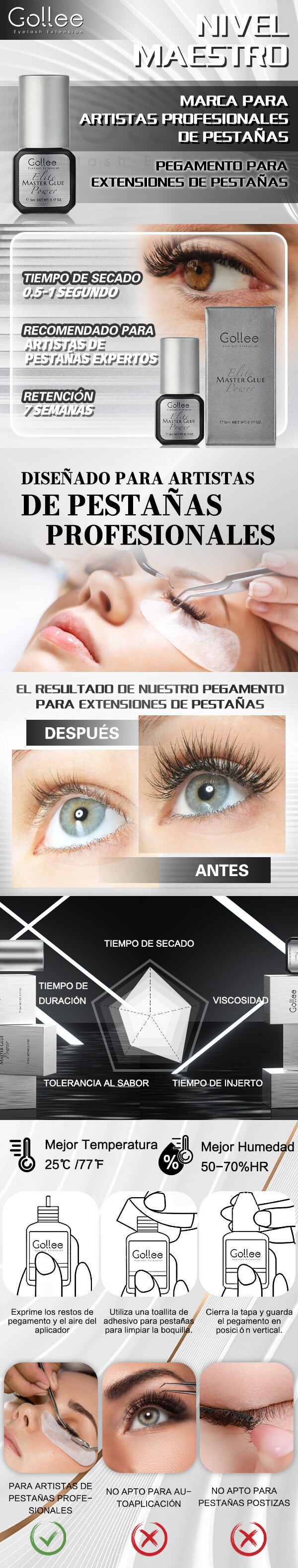 ELITE POWER" Tiempo de secado rápido de 0.5-1 segundos combinado con una retención excepcional, lo convierte en una excelente elección para artistas expertos en extensiones de pestañas.